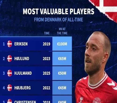 德转列丹麦球员历史身价榜:埃里克森1亿第1,霍伊伦6500万第2