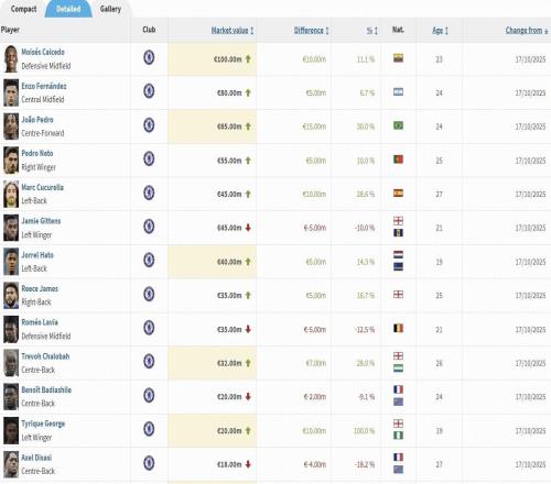 北京时间10月17日,德转更新了英超球员身价,切尔西身价变动球员如下。莫伊塞斯-凯塞多,上涨1000万欧,现身价1亿欧...