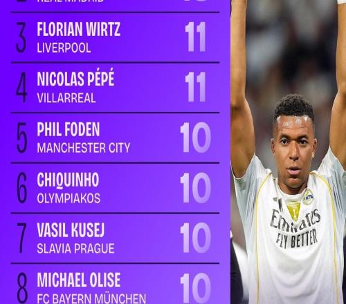 本赛季欧冠创造机会排行榜:姆巴佩、居莱尔、维尔茨前三