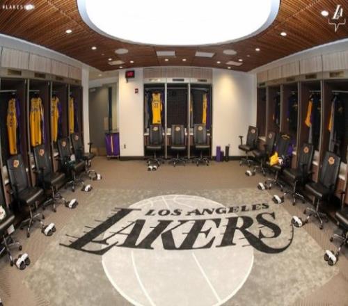 赛前,湖人官方晒出了全新更衣室的图集,今夏球队做出了全面升级,现在屋顶上有一个大的湖人logo,球员们的椅子也都换了。