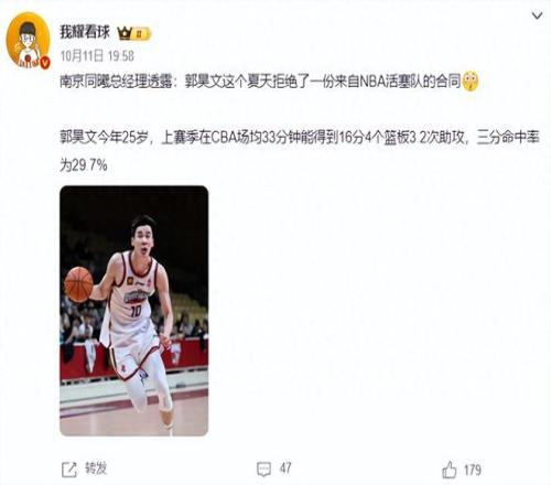 曝郭昊文拒绝NBA活塞队的合同