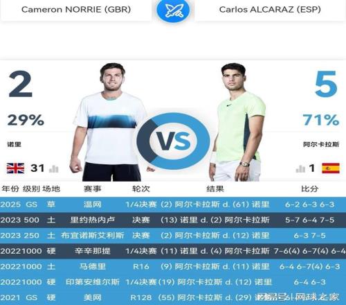 2023年之后,随着年事渐高、伤病侵袭,诺里状态起伏、战绩下滑,世界排名绯徊在第30位左右。职业生涯至今,诺里与阿尔卡拉斯交锋七次,取得两胜五负的战绩。相比其他高排位选手,诺里这个战绩已经殊为难得了。这说明诺里技战术水平仍在,犹有一战之力,让谁也不敢等闲视之。