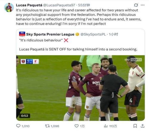 在周日晚进行的英超第13轮比赛中,西汉姆联主场0-2不敌利物浦,其中帕奎塔在比赛中因为向裁判抱怨连续吃到两张黄牌被罚离场。