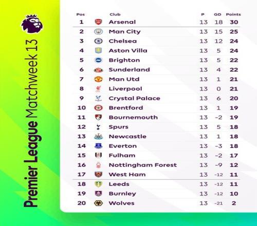 英超积分榜:阿森纳5分优势领跑